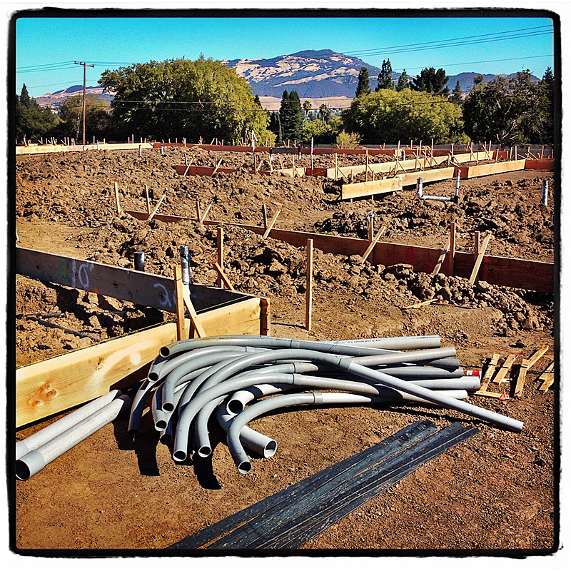 The first foundations begin, Mt. Diablo in the distance, where the quail have likely flown…